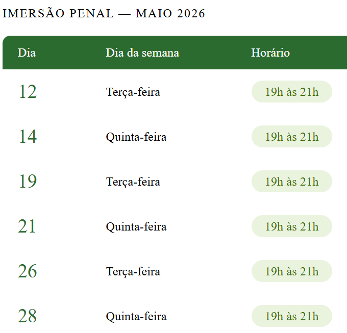 A proposta da imersão é proporcionar um estudo concentrado, profundo e altamente direcionado à prova, permitindo que o aluno domine um dos temas mais importantes do Direito Penal para concursos.