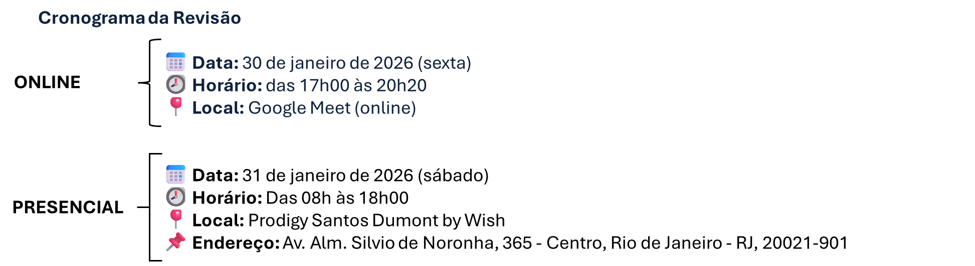 💡 Chegue com antecedência para garantir seu lugar e aproveitar a experiência completa da Revisão de Véspera TJRJ!